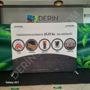 - Görselin kesintisiz ve tek parça görünmesi ürünü, örümcek stand veya centro stand gibi diğer arka plan reklam standlarından ayıran en olumlu özelliğidir.